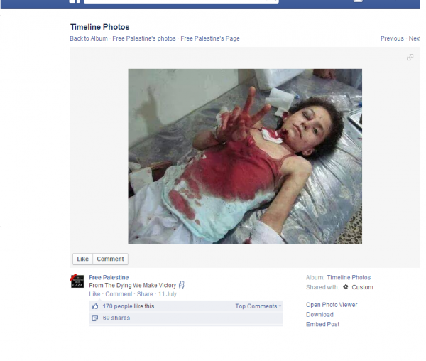 I grieve for the suffering of people on both sides in the conflict. But one does wonder just how much of the suffering is staged, how much of it is intentionally caused by Hamas (by turning civilian sites into war zones), and how much is completely manufactured, blatant lies like this one. “Free Palestine” put this picture up on their own site. 170 of their followers “liked” it, 69 shared it.